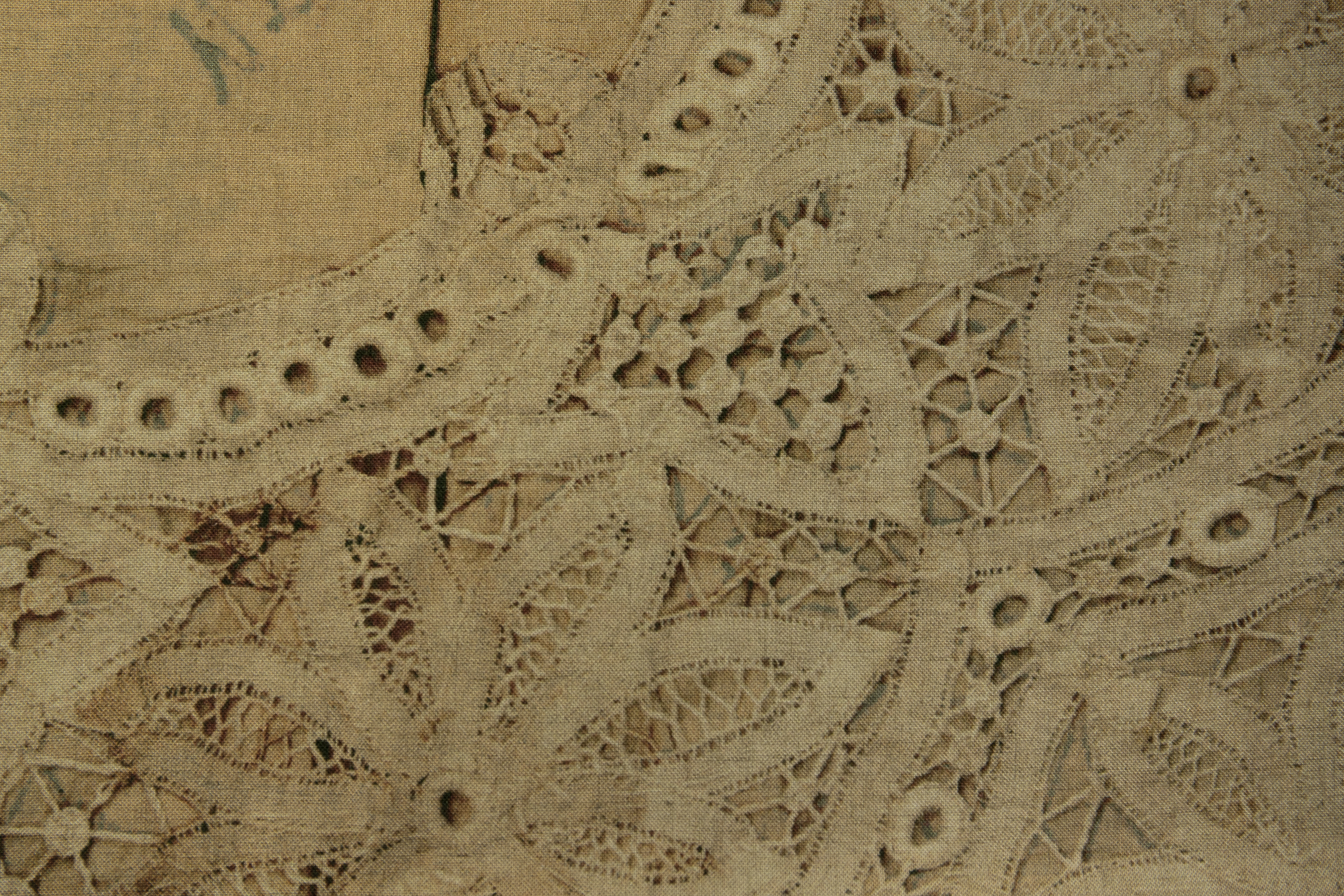 しなやかなレーヨンリネンの素材に、レースと新聞紙のプリントを施した生地です。モチーフとなった精密なレースは、昭和初期に実際に制作されていたもので、よく見ると下絵と見られる図柄も。台紙として使われていた新聞紙には、当時の生活の一部が綴られています。
