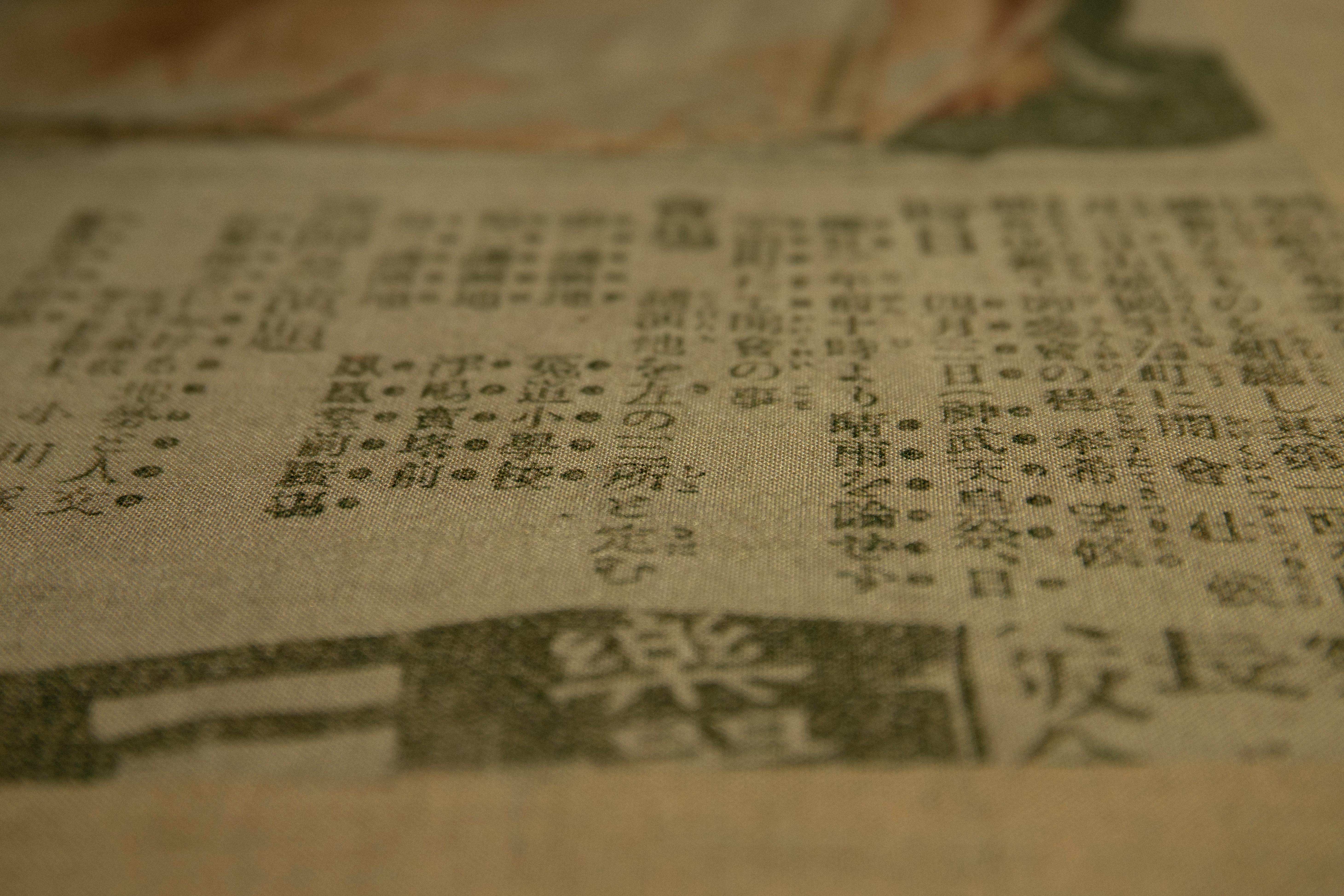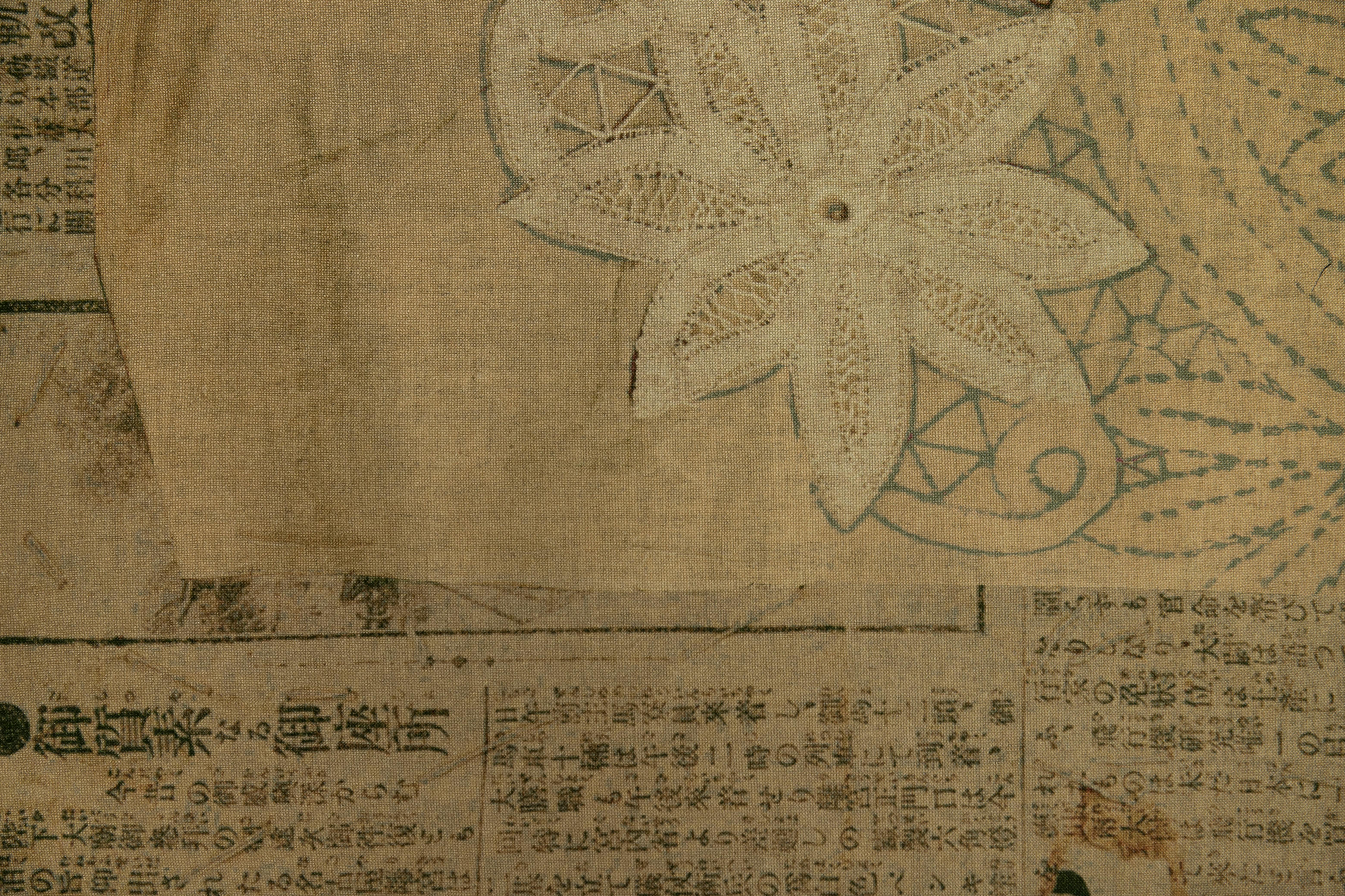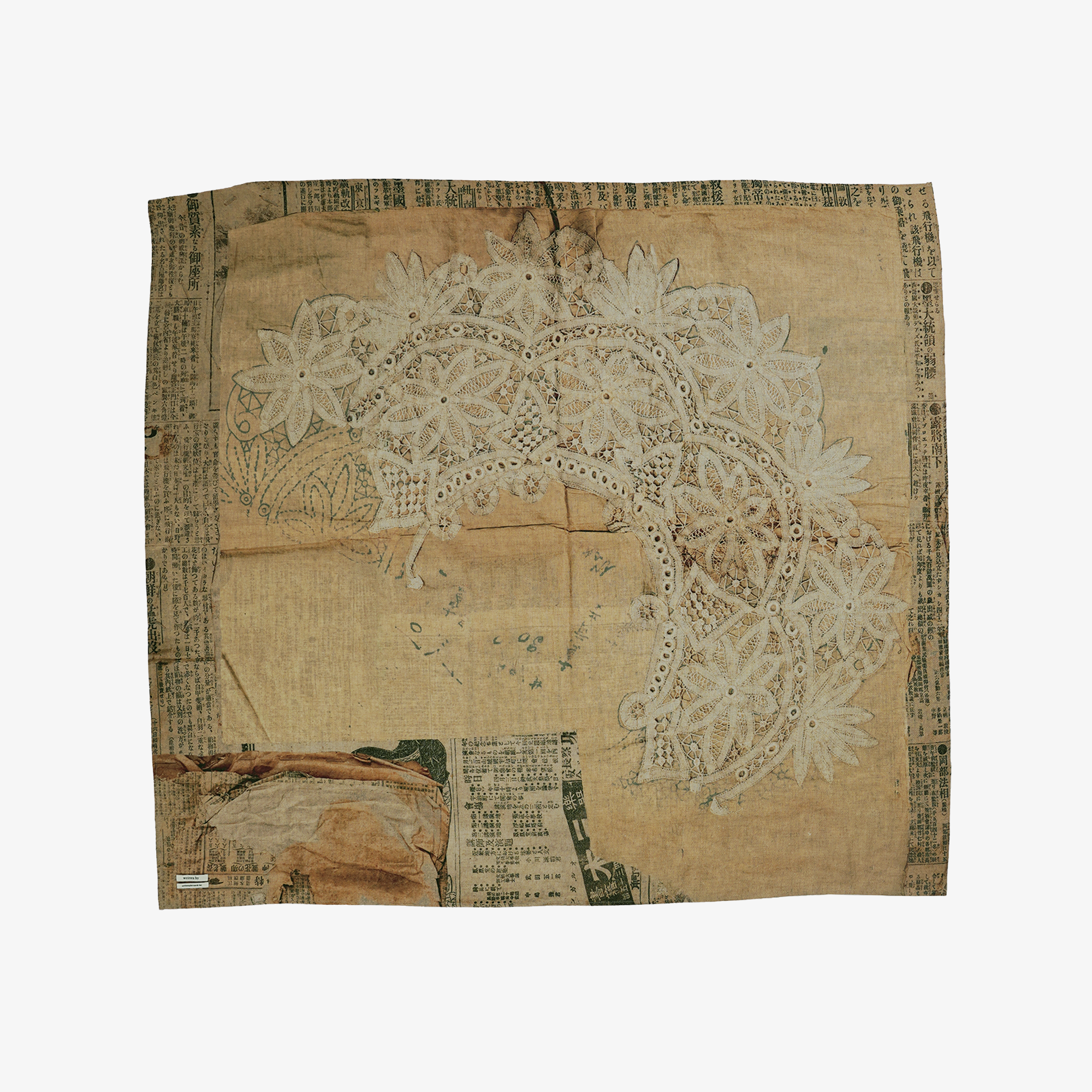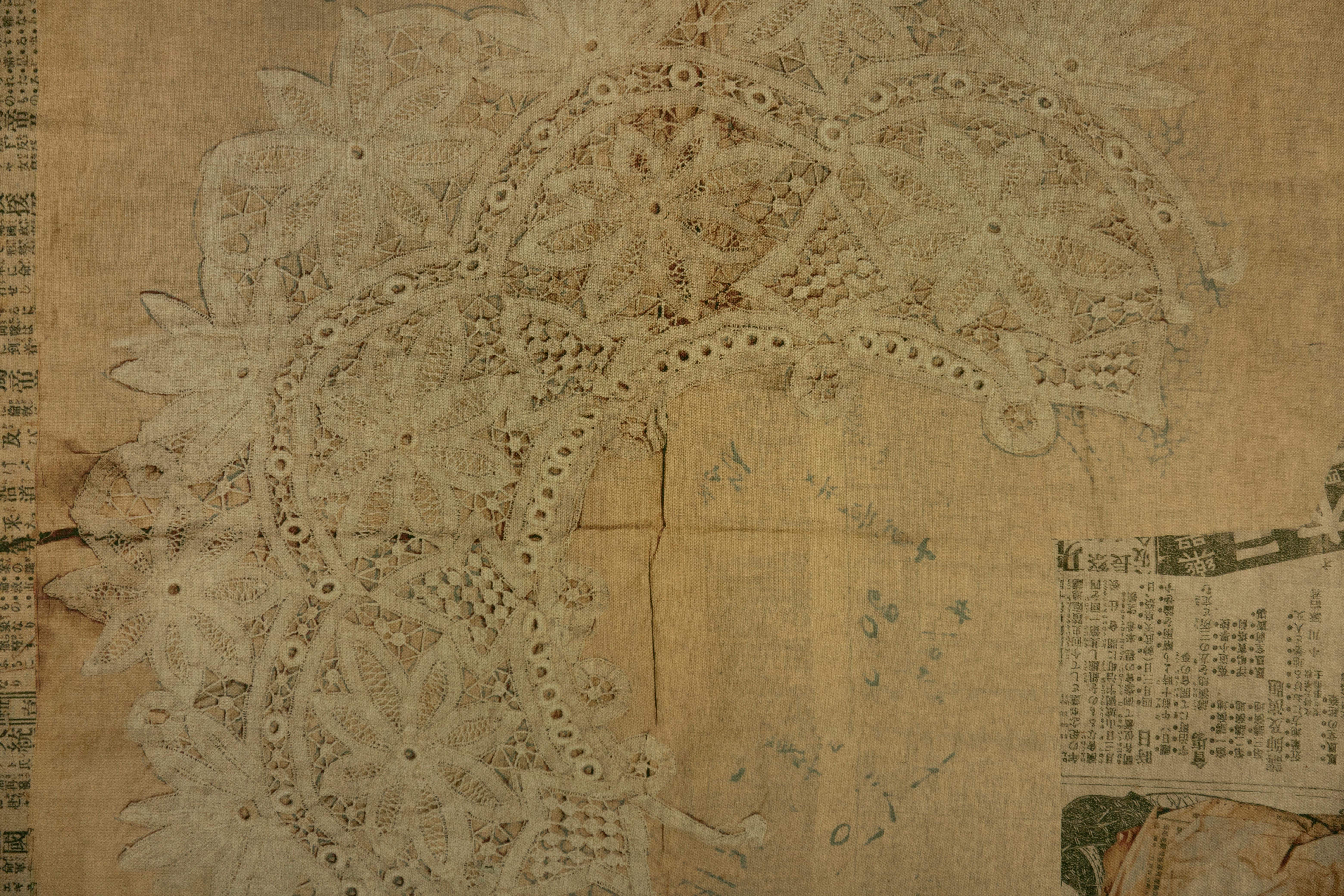 This fabric is made of supple rayon linen with lace and newspaper prints. The precise lace motif was actually produced in the early Showa period (early 20th century), and if you look closely, you can see a design that appears to be a rough sketch. The newspaper used as a backing paper describes a part of life in those days. It is a piece of time that has stopped flowing, clothed in memories of the distant past.
