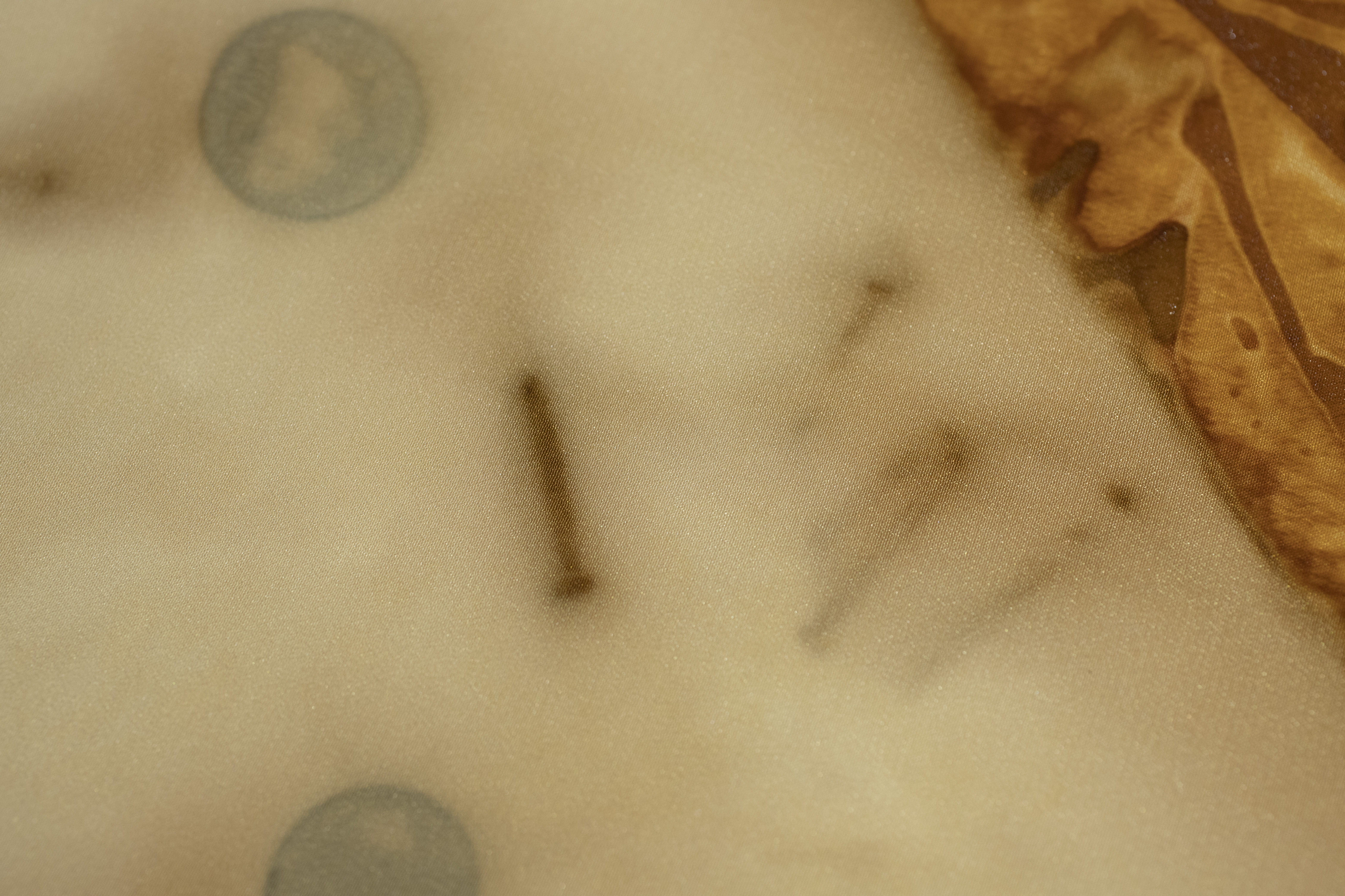 シルク100%の素材に、さび染めを施した生地です。さび染めとは、さびた金属のモチーフを、酢水を含ませた布に密着させ、時間を置くことで、滲み出たさびで染める技法のこと。