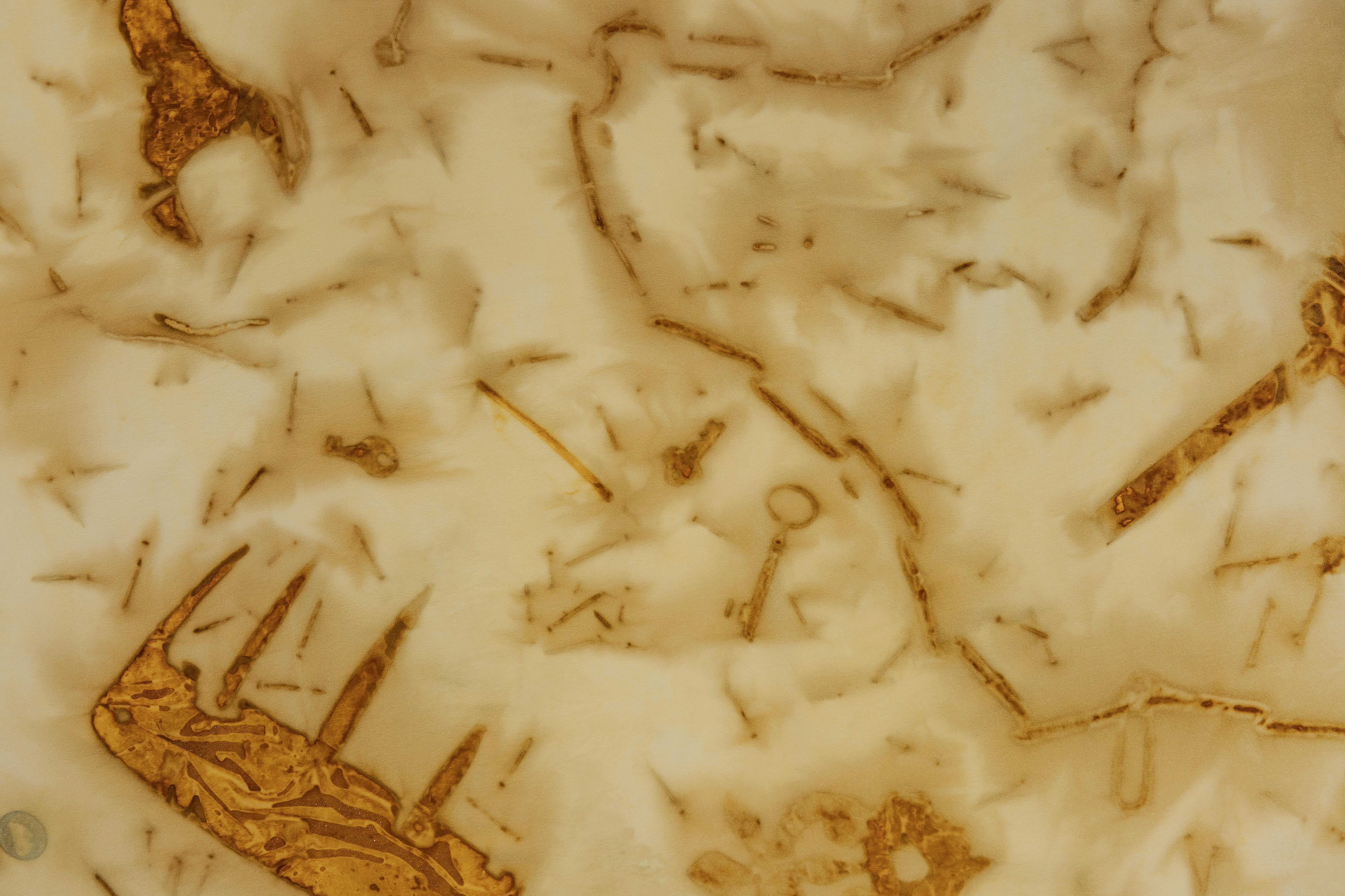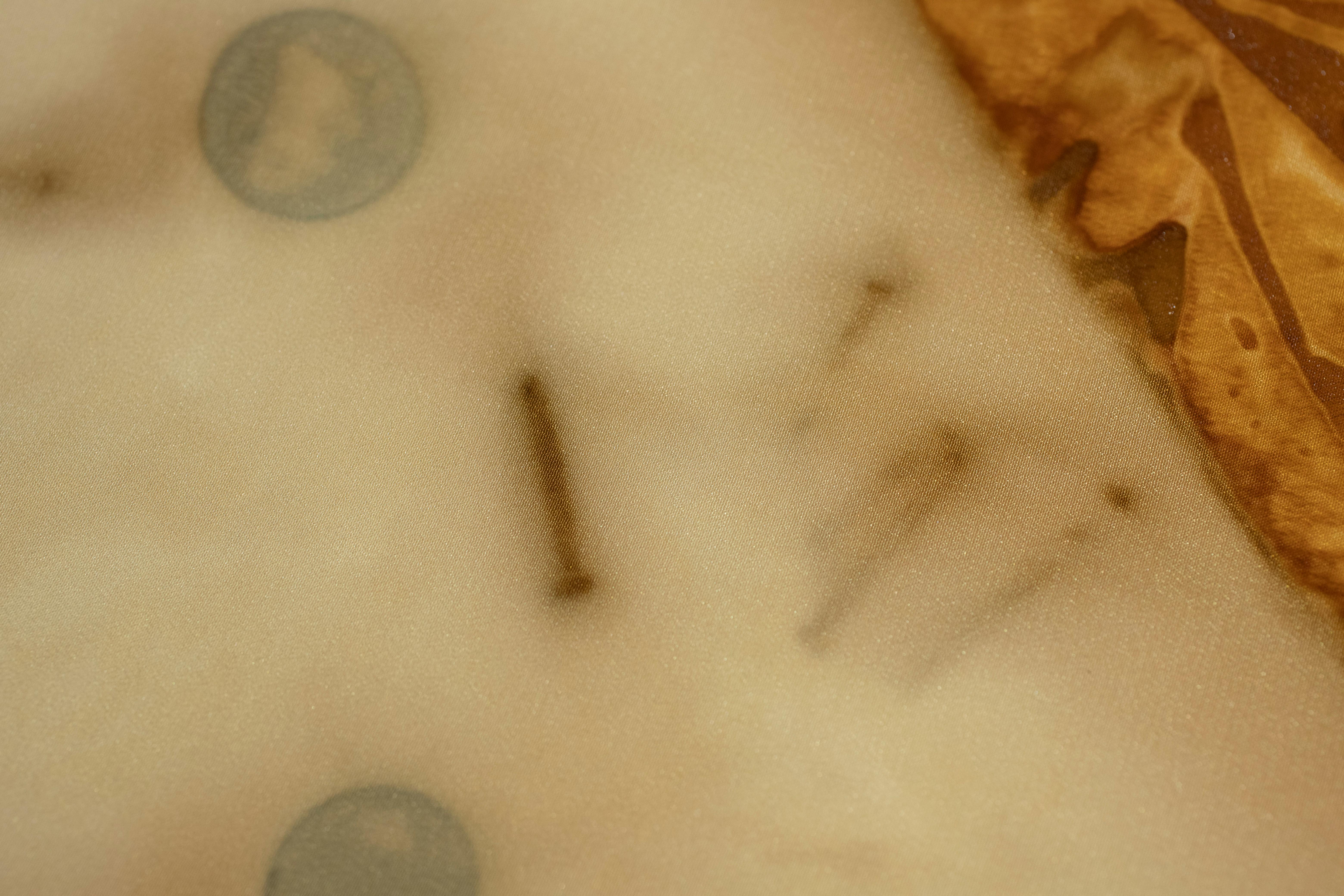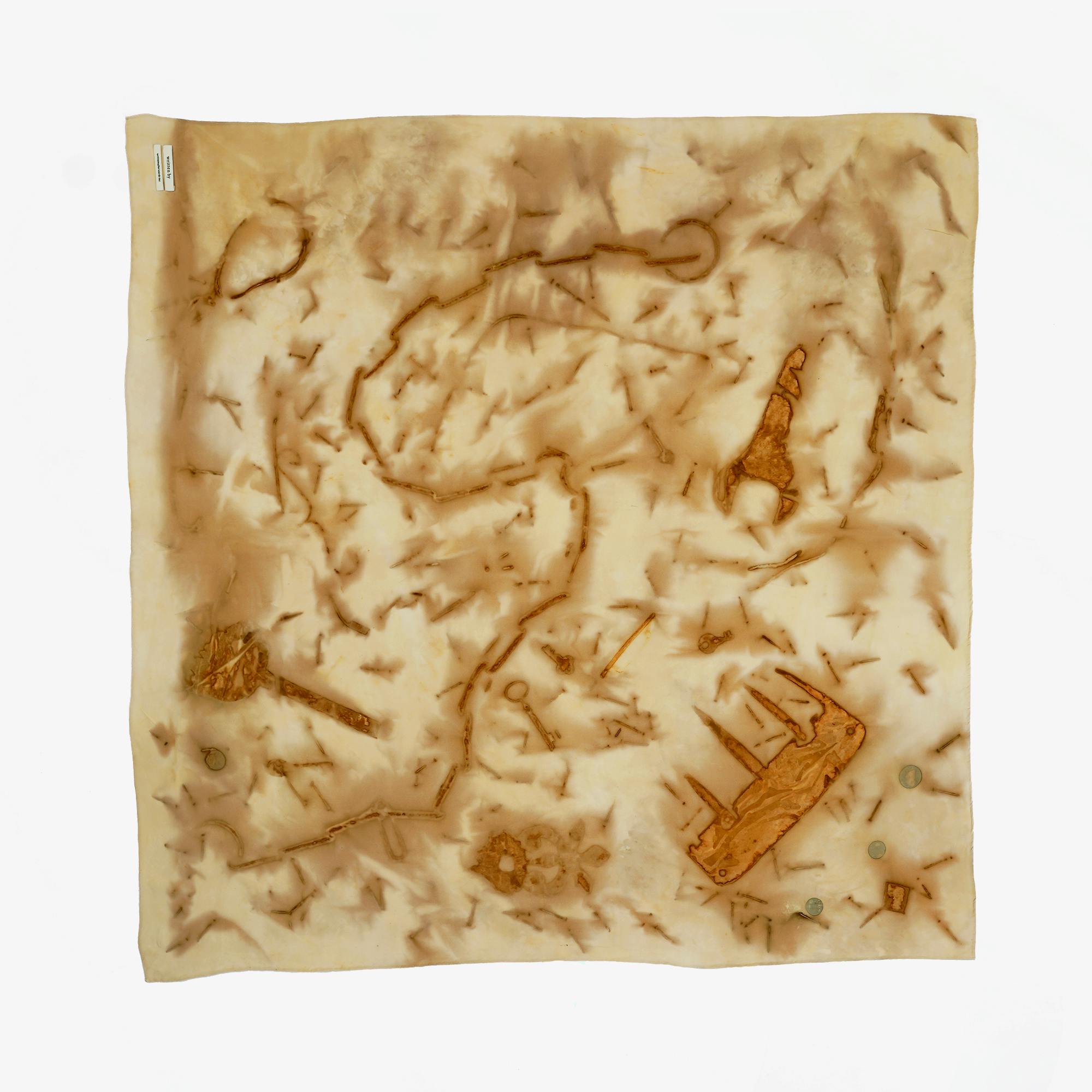 Rust-dyed fabric made of 100% silk. Rust-dyeing is a technique in which rusty metal motifs are dyed by adhering them to a cloth moistened with vinegar water and allowing time for the rust to ooze out.